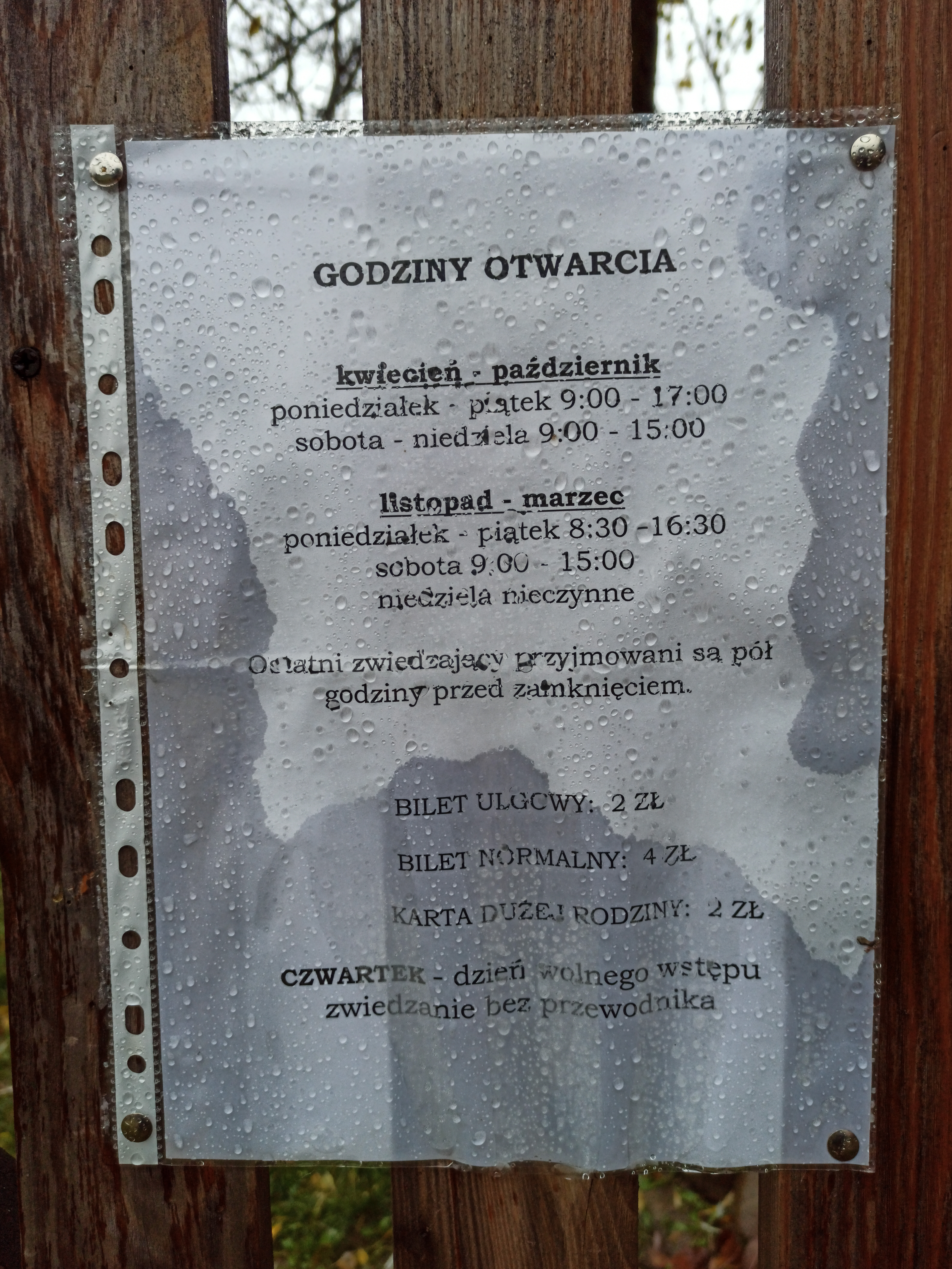 Ceny: normalny 4 zł, ulgowy 2 zł, zwiedzanie z przewodnikiem 15 zł.