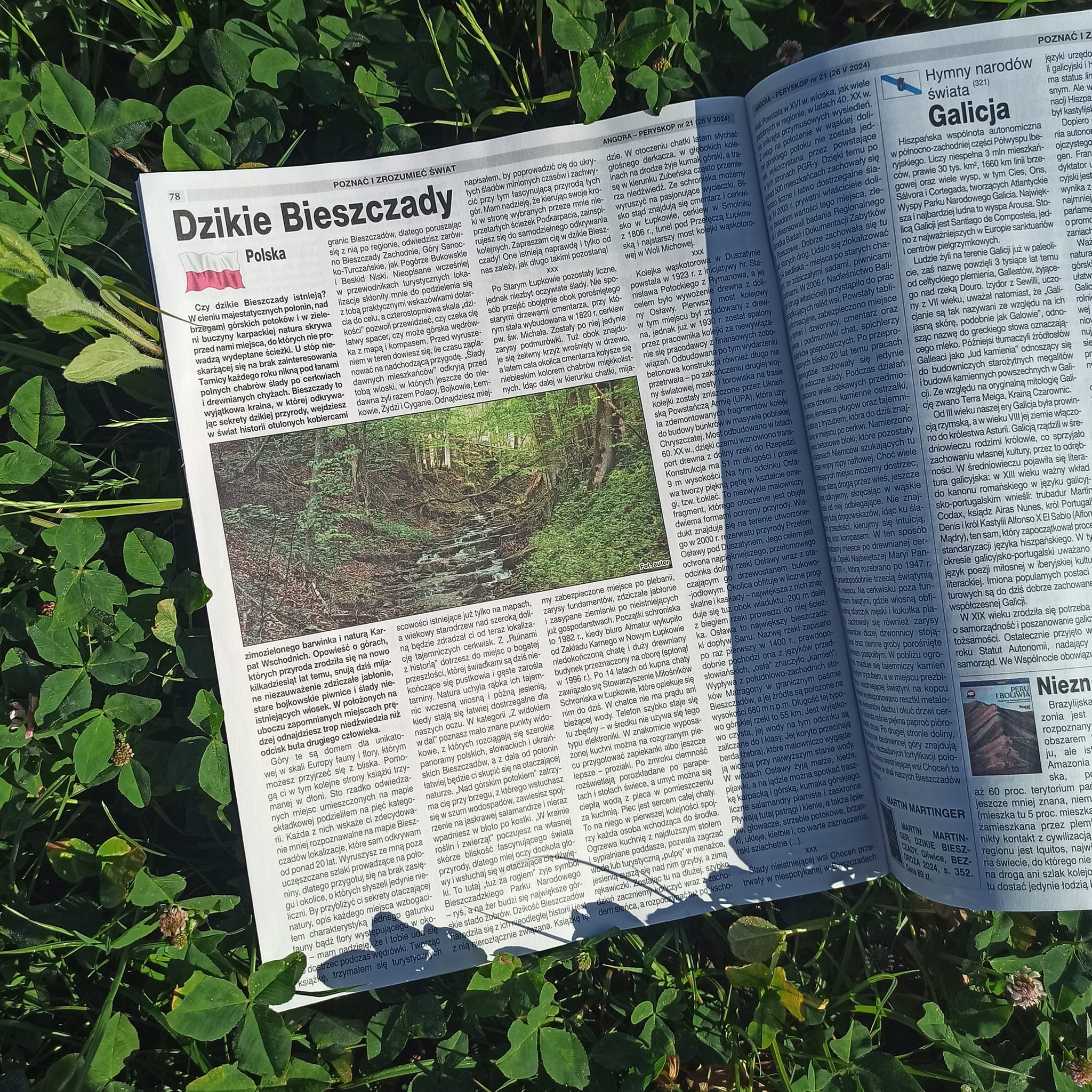Ku mojemu wielkiemu zdziwieniu i nieskrywanej radości w maju 2024 r. zadzwoniła do mnie Kasia Suchy z zapytaniem: „Czy widziałeś dzisiejsze wydanie Angory!?”. No to zobaczyłem! W numerze 21 (1771) 26 maja na str. 78 i 79 opublikowano fragmenty mojej książki „Dzikie Bieszczady. 100 nieznanych miejsc blisko natury” dodając do nich moje zdjęcie! Dobrych kilka chwil myślałem, że to jakiś żart! Za dzieciaka co tydzień czytałem Angorę. 🙂